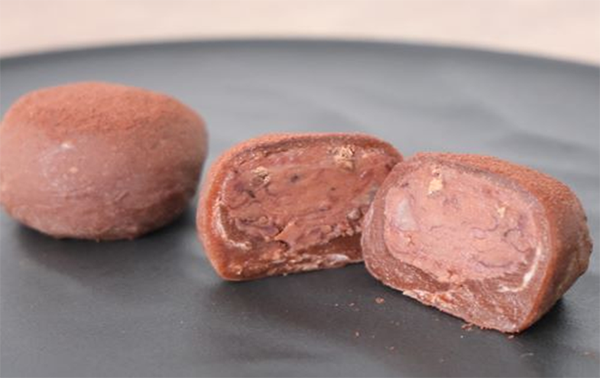 ココアパウダーを練り込んだ求肥で粒あんをたっぷりと包んだ大福ショコラ。