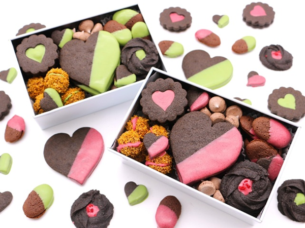 - 焼き上がったサブレが冷めたらピスターシュコートグリーン、フランボワーズコートレッドでトランペする。